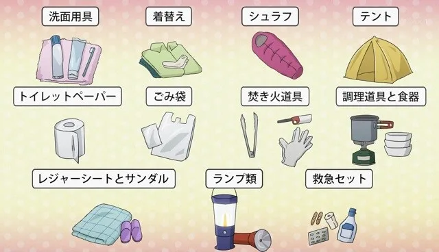 画像ではこのように紹介がありますが、レジャーシート、サンダルはなくても大丈夫です。トイレットペーパーもティッシュペーパーなどで代用可能だと思います。このほかに食材はもちろん必須ですね。 ソロキャンプとかですと着替えもいらないという人もいます。着替えって意外と荷物になるんですよね。